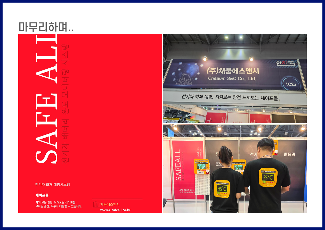 (주)채움에스앤시는 2025년 09월 17일~19일까지 일산 KINTEX에서 개최된「2025 대한민국 안전산업박람회」에 참가하여 세이프올(SafeAll) 전기차 화재예방 시스템을 선보였습니다.