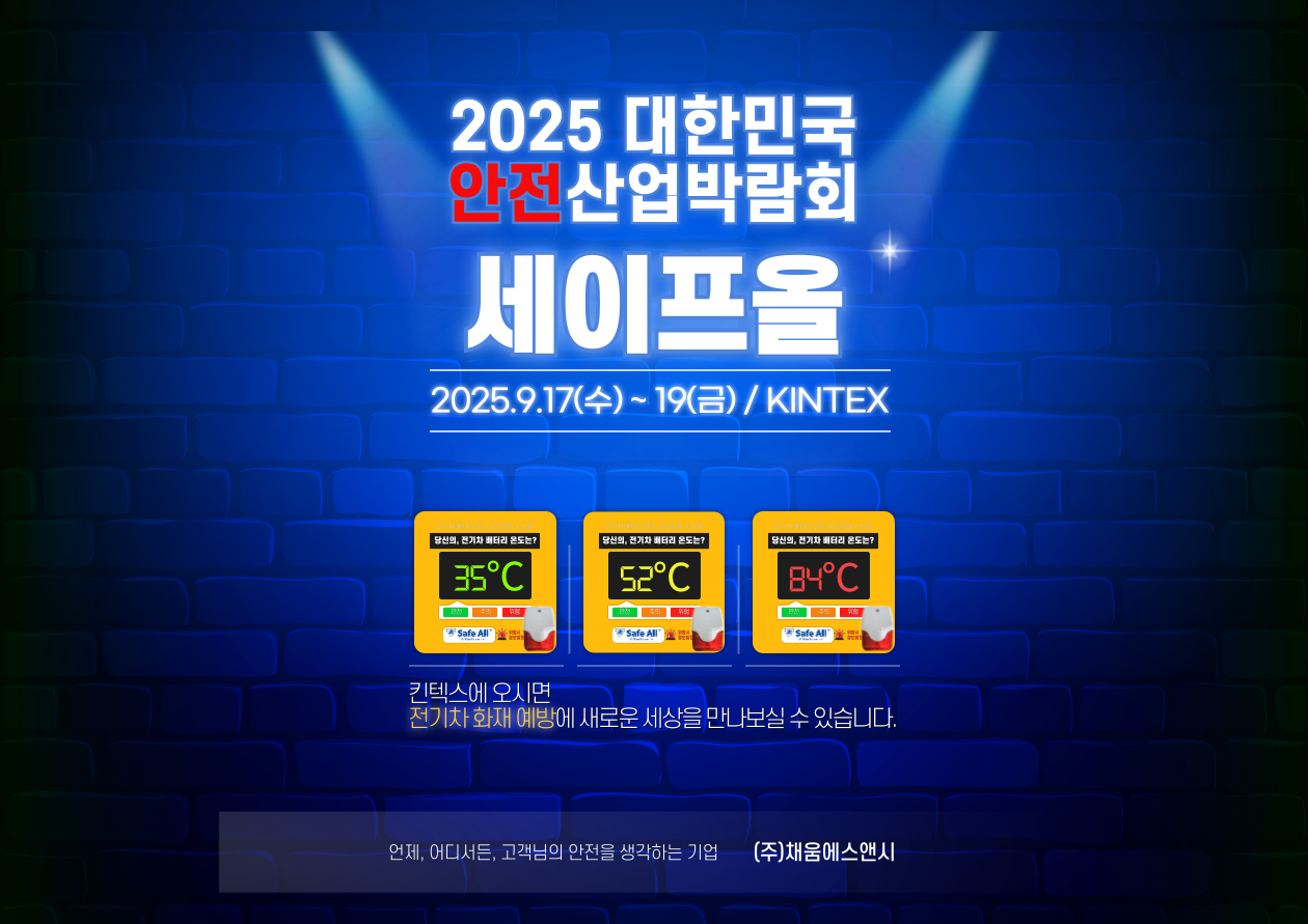 (주)채움에스앤시는 2025 대한민국 안전산업박람회를 통해 세이프올 전기차 화재예방 시스템을 많은 분들께 소개할 수 있는 뜻 깊은 시간을 가졌습니다.